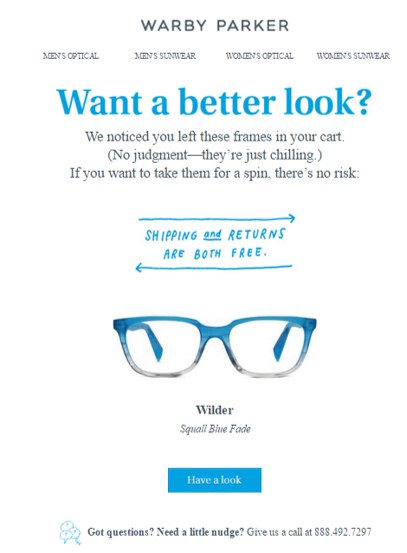 倭黑猩猩当然知道如何创建一个独特的购物车放弃电子邮件。 该品牌使用他们的真实调的打造,抓住从标题消费者的注意正确的一个有吸引力的电子邮件。 此外,复制专注于提供帮助,同时呼吁采取行动是明确的,旨在提高转换与直接的方法。