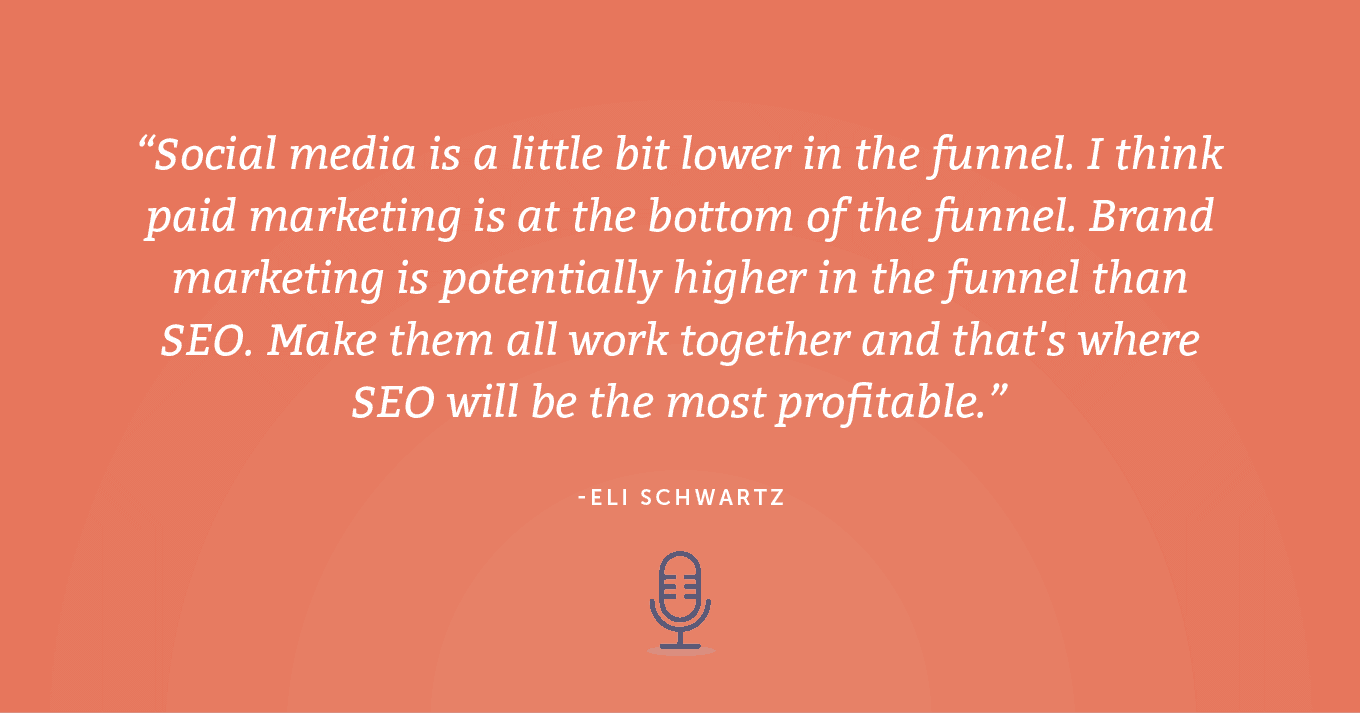 - “社交媒体在漏斗中的地位略低一些。 我认为付费营销处于漏斗的底部。 渠道中的品牌营销可能比 SEO 更高。 让它们一起工作,这就是 SEO 最有利可图的地方。”