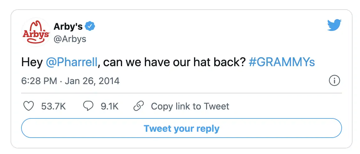 Arby 的推文取笑了 Pharrell Williams 在格莱美颁奖典礼上戴的超大帽子,立即在网上疯传。