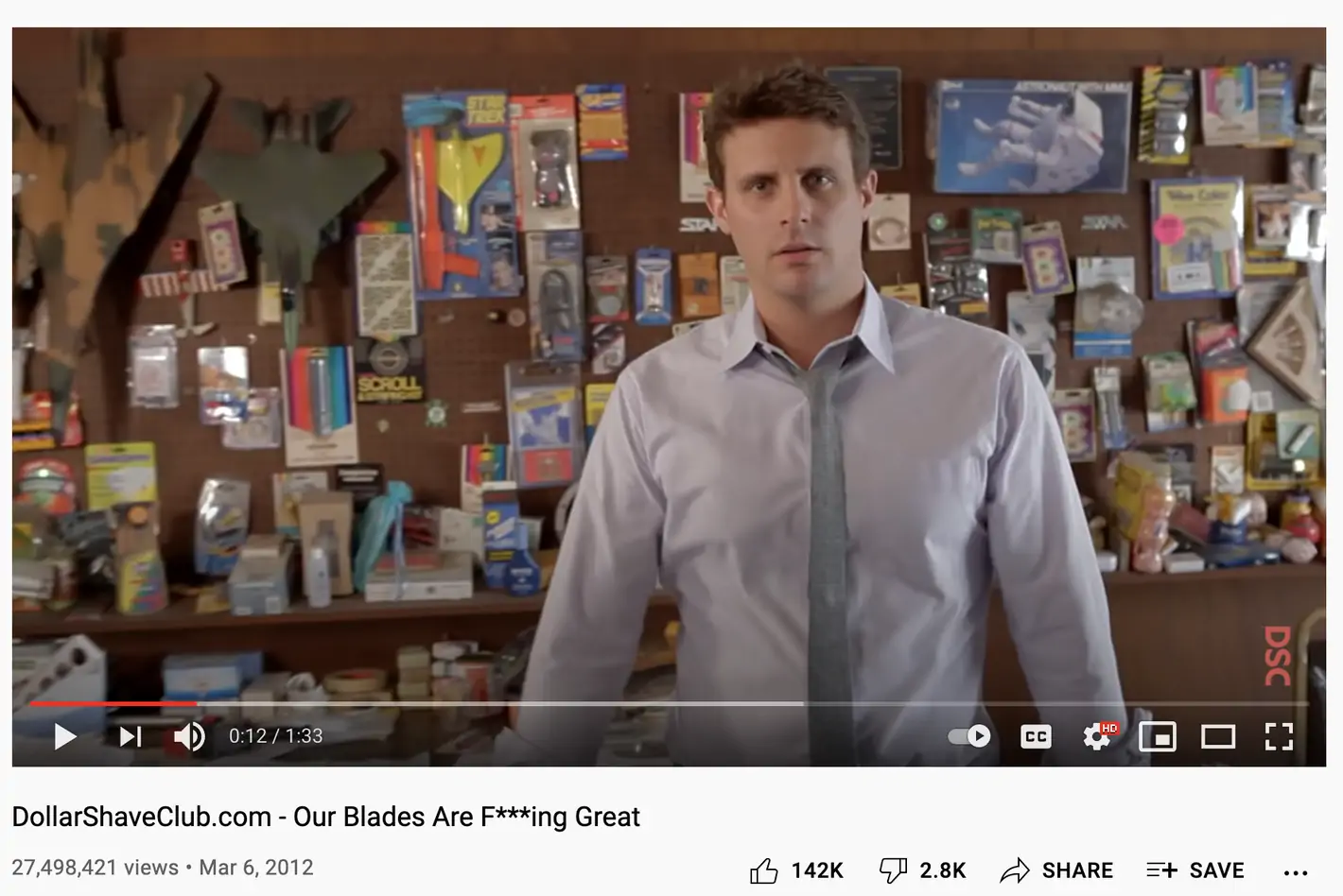 这则拥有超过 2700 万浏览量的 Dollar Shave Club 广告让人们评论说:“9 年后,它仍然是我们现代历史上最伟大的单一营销广告。”