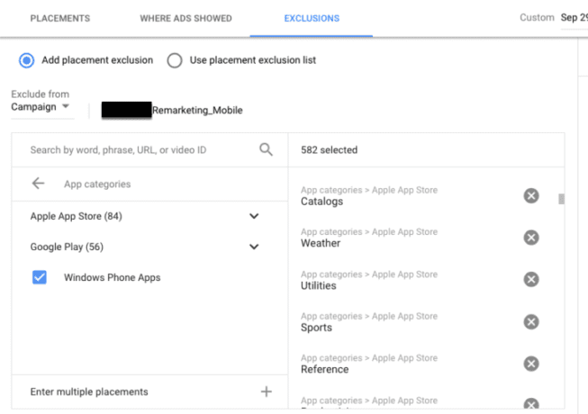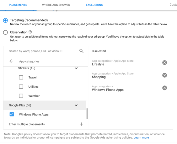 因此,理论上,我们可能会再次拆分移动广告系列以专门隔离移动应用。 特别是如果我们发现成本成为一个问题。 因此,在一个广告系列中,我们可以排除移动应用类别以及漏掉的任何其他移动应用展示位置。 在另一个活动中,我们可以选择所需的应用程序类别,并使用定位而不是观察。