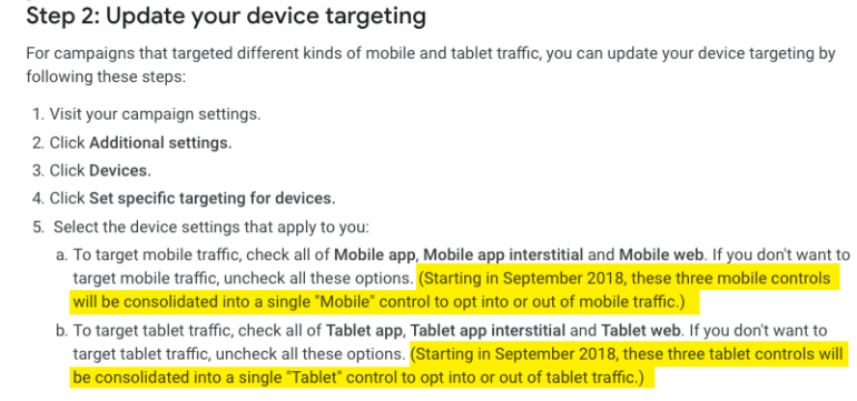 2018 年 9 月,adsenseformobileapps.com 排除和 GMob 移动应用非插页式排除在 Google Ads 中将不再可用。 设备设置也将合并为三种设备类型:电脑、手机和平板电脑。