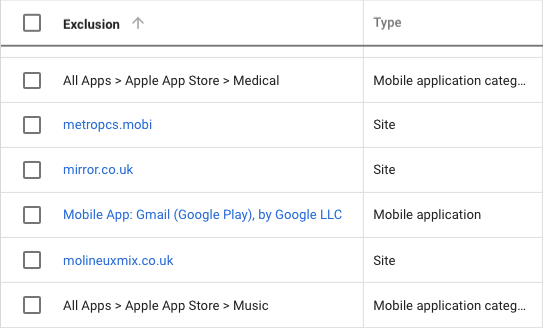 在另一个 Lead Gen 帐户中,我们只发现移动应用产生了支出,但没有产生任何转化。 因此,我们尝试排除所有 Google Play 和 Apple App 类别。 不幸的是,这并没有阻止我们的广告在移动应用中展示。