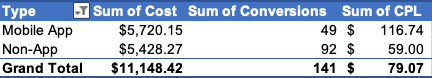 在一个 Lead Gen 帐户中,我们可以看到转化正在移动设备上进行。 经过进一步分析,与非移动应用程序展示位置相比,移动应用程序的 CPL 几乎翻了一番。 在这种情况下,鉴于更高的 CPL,这可能不是我们预算的最佳用途。 特别是因为我们无法验证这些潜在客户的质量。 帮助验证质量的一种方法是确保您仅将有价值的操作作为转化进行跟踪。