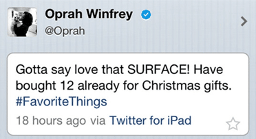 微软与奥普拉合作推广公司当时最新的笔记本电脑 Microsoft Surface。 在温弗瑞的推特错误导致微软受到打击之前,这看起来是一次成功的社交媒体活动。 温弗瑞在 Apple 的 iPad(她打算推广的 iPad 的直接竞争对手)发来的帖子中支持了新的微软笔记本电脑。