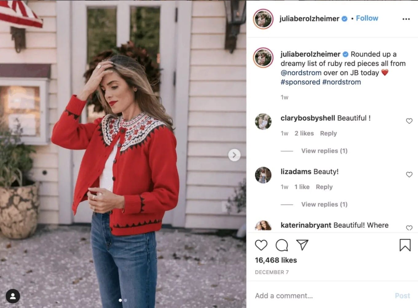 @juliaberolzheimer 的这篇帖子清楚地标记了@nordstrom 并指定该帖子是赞助的。 一个重要的法律因素。