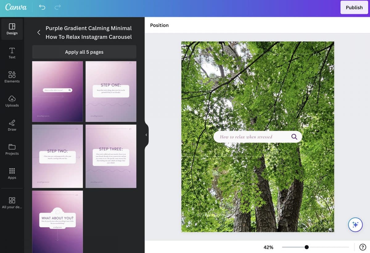 对于创意编辑,我使用 Canva,这是另一个免费的社交媒体营销应用程序(具有付费订阅选项)。 它非常适合设计文本叠加层、将剪辑剪辑在一起以及添加免版税音乐。