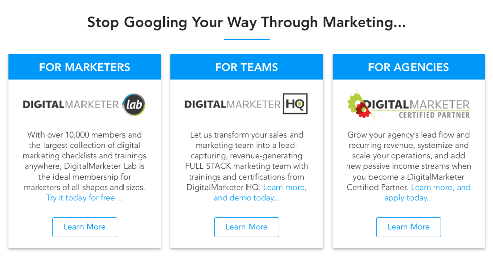 这是您主页的一部分,不断解释您的产品是为谁服务的。 你的主页已经明确了你的客户头像是谁,但是这个部分可以用来扩展更多的细节。 以下是 DigitalMarketer 主页如何详细介绍我们的 3 个客户头像: