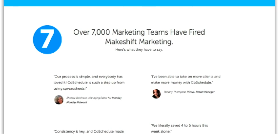 这是他们建立信任的地方,我们之前通过推荐和社会证明( “超过 7,000 个营销团队已经解雇了临时营销” ):