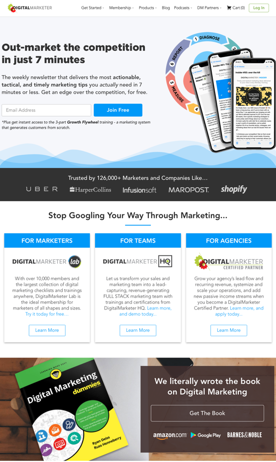 这是 DigitalMarketer 主页。 这大约是整个页面的 3/4(单击此链接可查看整个页面)。 请注意副本是多么少,以及您如何已经看到 5 个不同的号召性用语。