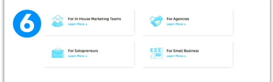 主页是不同的。 主页不推动行动。 您的主页上肯定会有号召性用语按钮,但它们不是主要事件。 在您的主页上,您希望做的不仅仅是创建操作。 您的主页的目标是阐明您的业务的好处,与访问者建立信任,并指出他们下一步可以做什么。