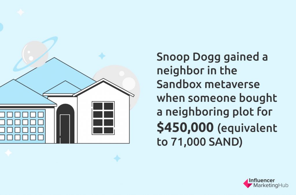 对元界属性的兴趣增加导致价格进一步上涨。 数字土地的售价从 6,000 美元到 100,000 美元不等,但据报道,有些土地的售价甚至更高。 过去一年最大的销售之一是位于 The Sandbox 的 Snoop Dogg's 附近的一处房产。 据称,一位匿名买家以 450,000 美元的价格购买了它。