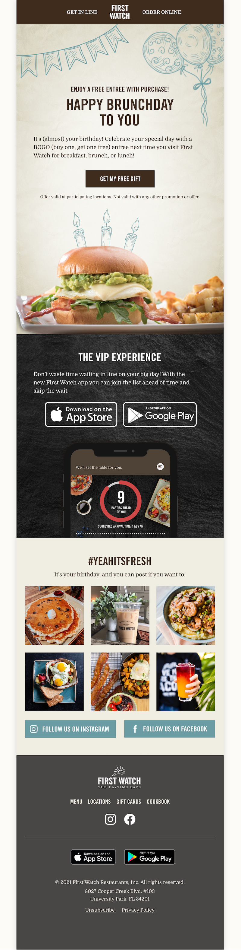 其他品牌,如 First Watch,喜欢在订阅者生日前滑入收件箱。 他们买一送一的“早午餐”优惠让人们有理由将餐厅添加到他们的生日行程中。