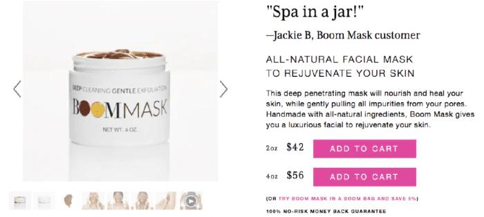 将其与 BOOM! 进行比较,后者充分利用购买框来重复产品的主要优势以及额外的社会证明、追加销售、评论等: