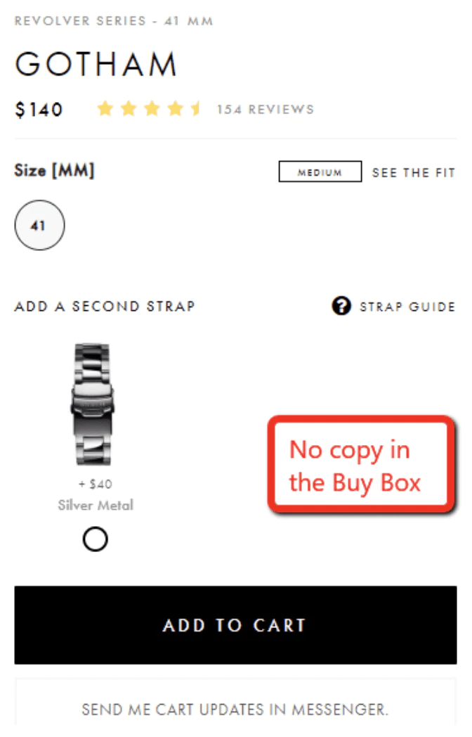 结果,他们的购买框无法有效地传达访问者应该购买的原因。 在此示例中,MVMT 通过在顶部附近显示其评论来展示社交证明做得很好,但它错过了包含一些非常重要的电子商务文案的机会。