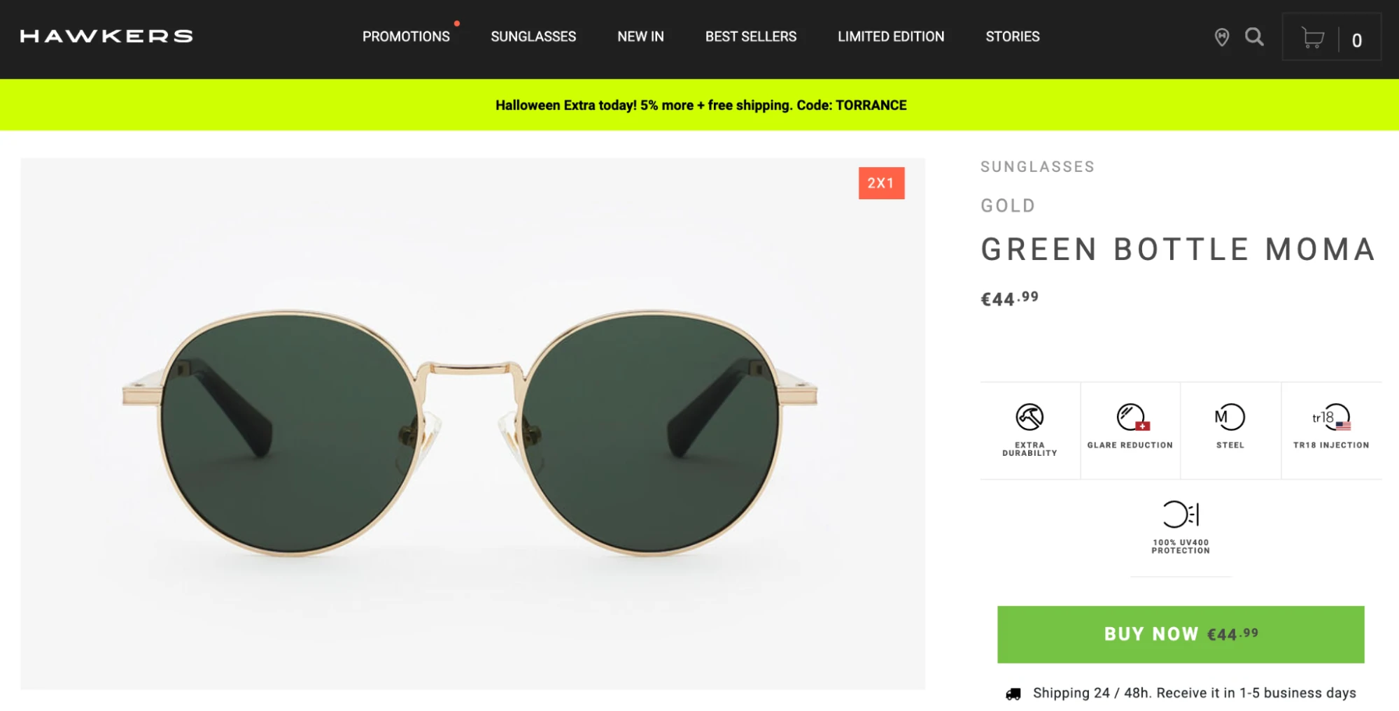 如果答案是否定的,没什么可说的,那么您可能会想要使用传统的产品页面。 许多易于理解或非常直观的产品就是这种情况,例如衣服或太阳镜,例如下面的小贩示例。