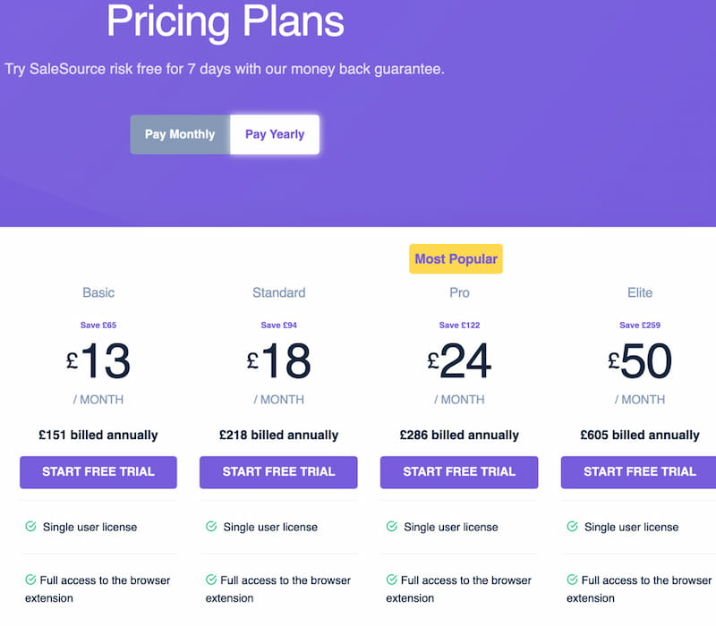 使用年度选项比每月支付便宜得多。 最实惠的月度SaleSource Basic 计划,每月收费 18 英镑,大约每月 24 美元。 您可以在 SaleSource 定价页面上查看每个定价计划的好处。