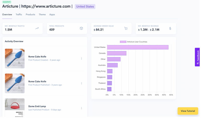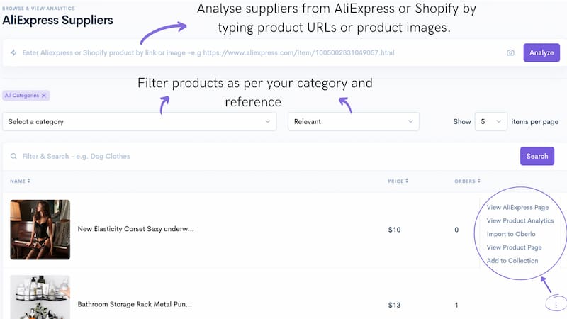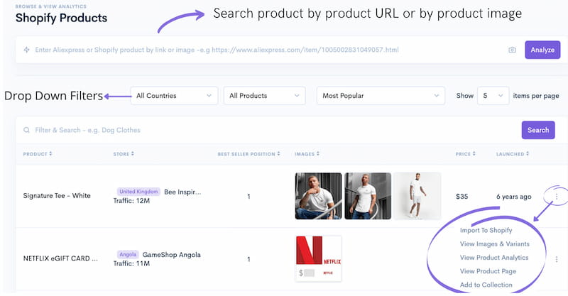 该工具是一款 AI 驱动的应用程序,与 Shopify 兼容并支持所有电子商务平台。 例如,如果您从速卖通采购并使用 Shopify 在线销售,它是最有效的工具之一。 有三个主要功能:商店分析、产品分析和供应商分析。 通过该工具的这三个组件,用户可以执行以下操作:
