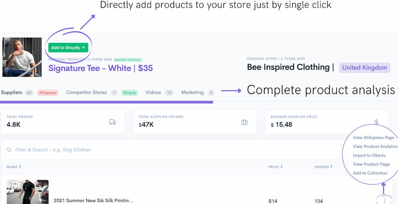 分析产品后,您可以将其直接添加到您的 Oberlo 帐户或跳转到产品 AliExpress 列表。 Salesource 还拥有许多复杂但可能鲜为人知的工具,可以将您的电子商务业务提升到一个新的水平。