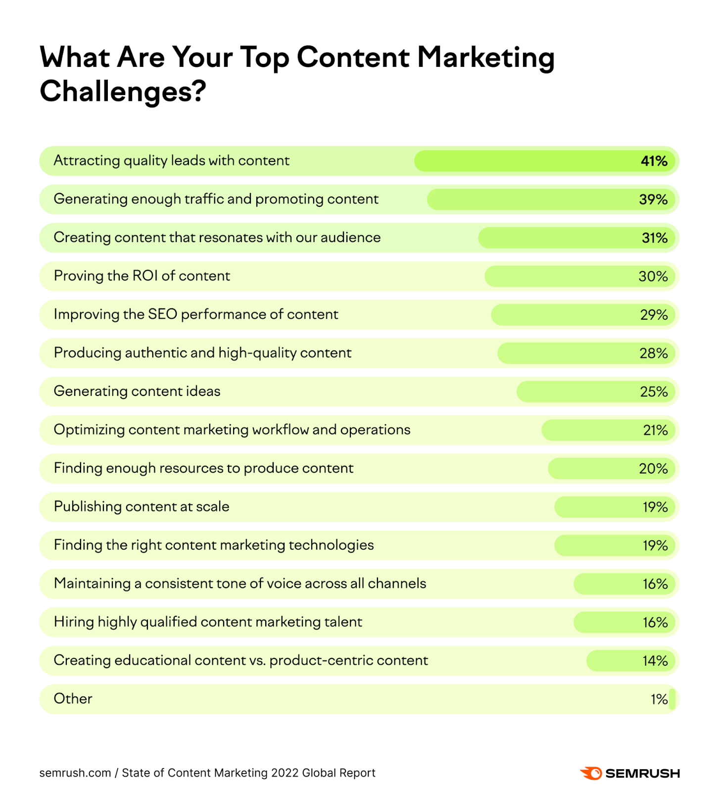 - 内容营销面临的最大挑战是吸引优质线索,其次是产生流量和创建以用户意图为中心的内容。 (塞姆拉什)