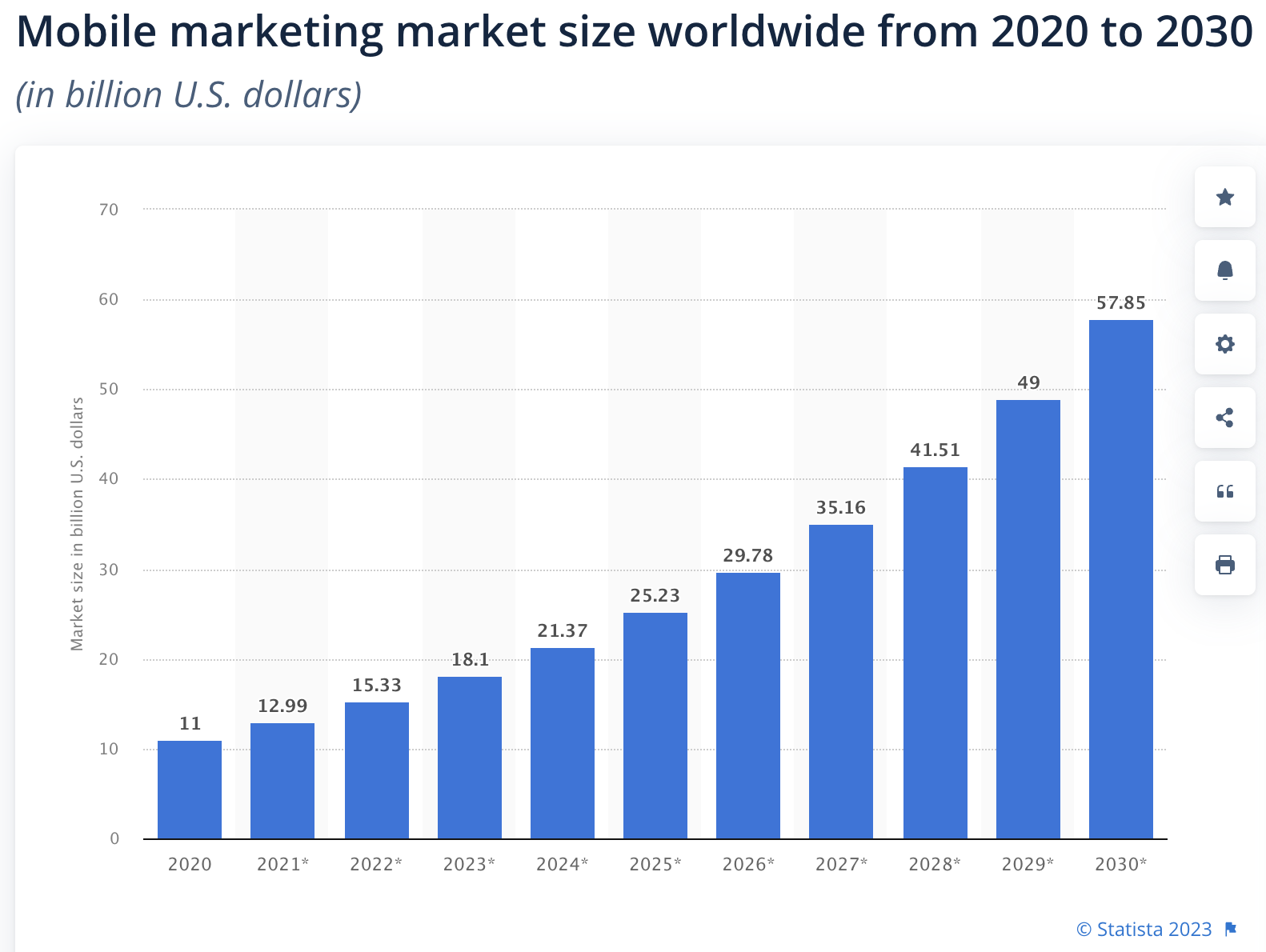 - 到 2030 年,移动营销将达到 570 亿美元。(Statista)