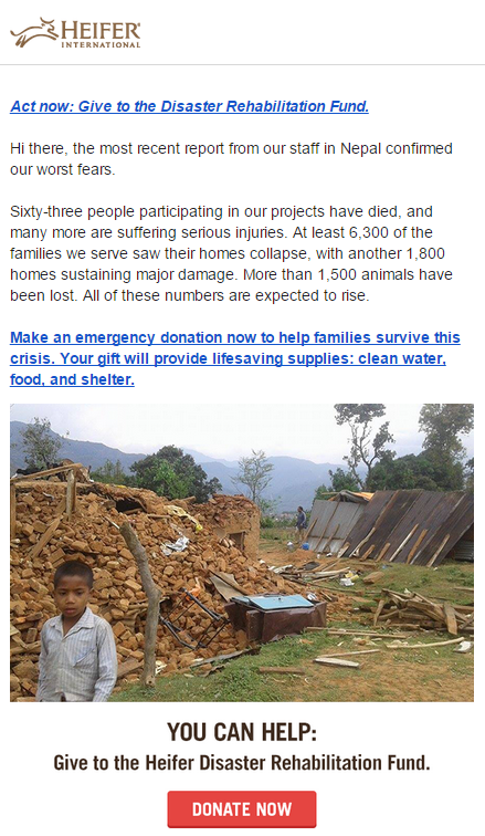 像 Heifer International 电子邮件中的按钮一样,颜色鲜艳的按钮是理想的选择,因为它可以吸引读者的注意力并且易于点击,即使您使用的是触摸屏。