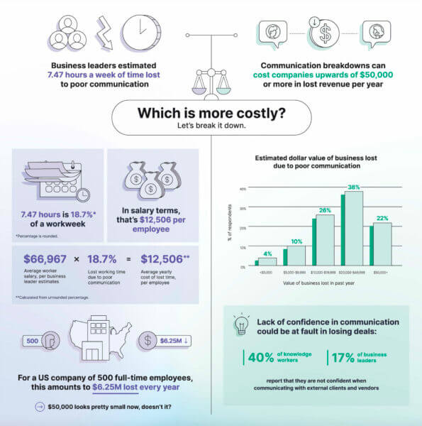 通过更好的沟通,他们可以回收多达五分之一的员工时间。 不解决这个问题的后果是显着的:超过十分之九的商业领袖表示,沟通不畅会影响生产力、士气和增长,并提到诸如成本增加、错过或延长最后期限以及声誉受损等影响。 五分之一的领导者甚至报告说由于沟通不畅而失去了业务或交易。