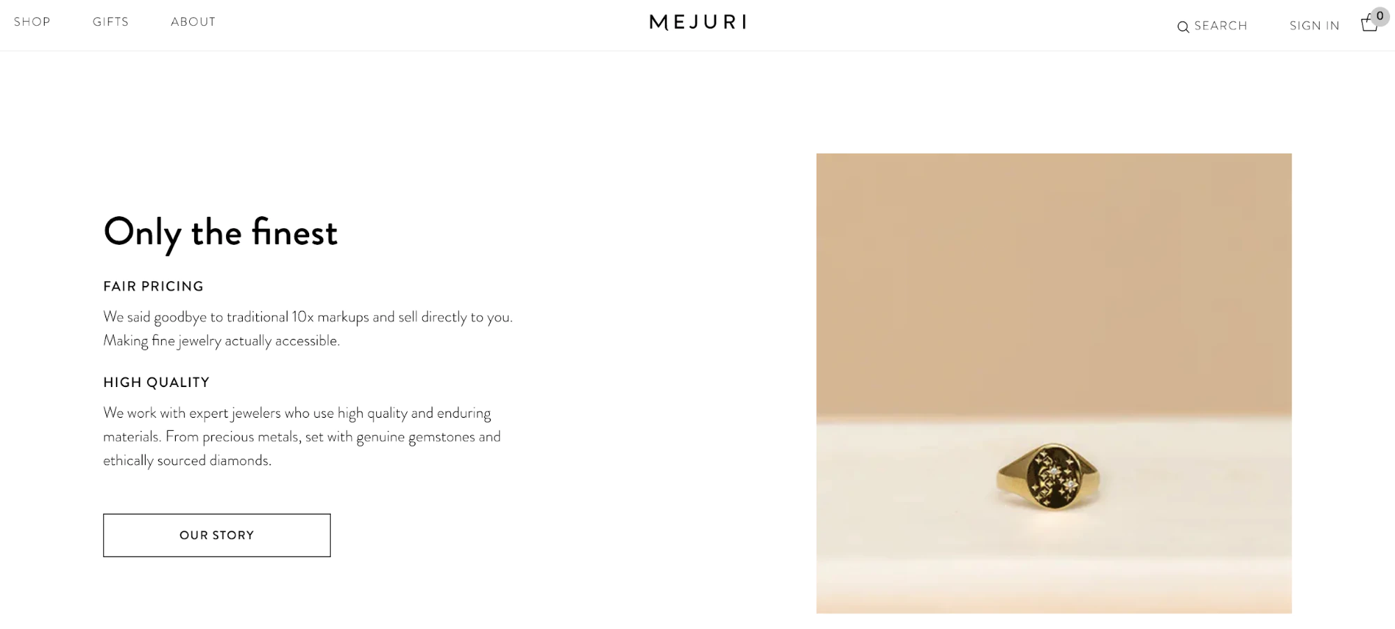 即使在讲述其品牌故事时,Mejuri 也将其主页文案保持得很紧,只有一到两句话。 鼓励想要了解更多信息的用户点击阅读其“关于我们”页面,但该公司注意不要用整个起源故事堵塞其主页。