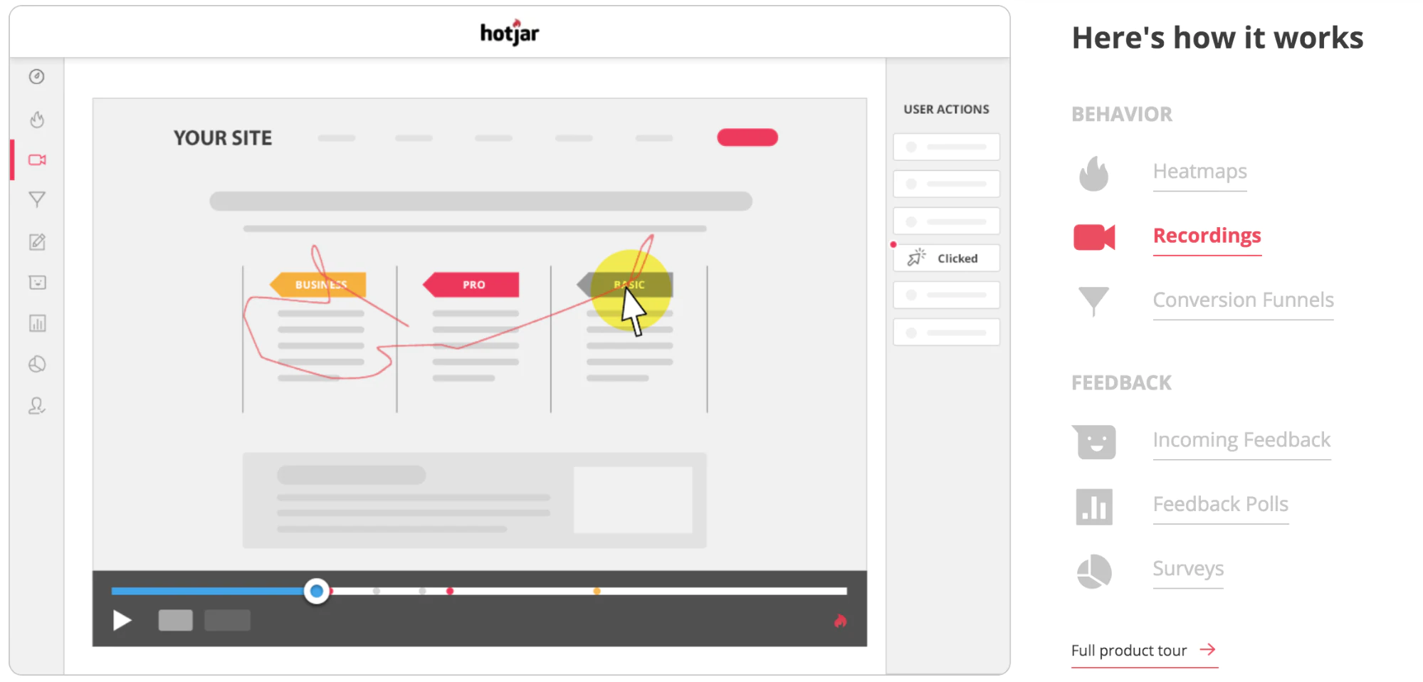如果不能立即清楚客户在哪里难以理解您的品牌或产品,请考虑观看一些实际用户的录制会话。 这可以使用 Hotjar 或 Lucky Orange 来完成,这两个应用程序可以在您的网站上创建会话记录,您可以将其作为视频观看。