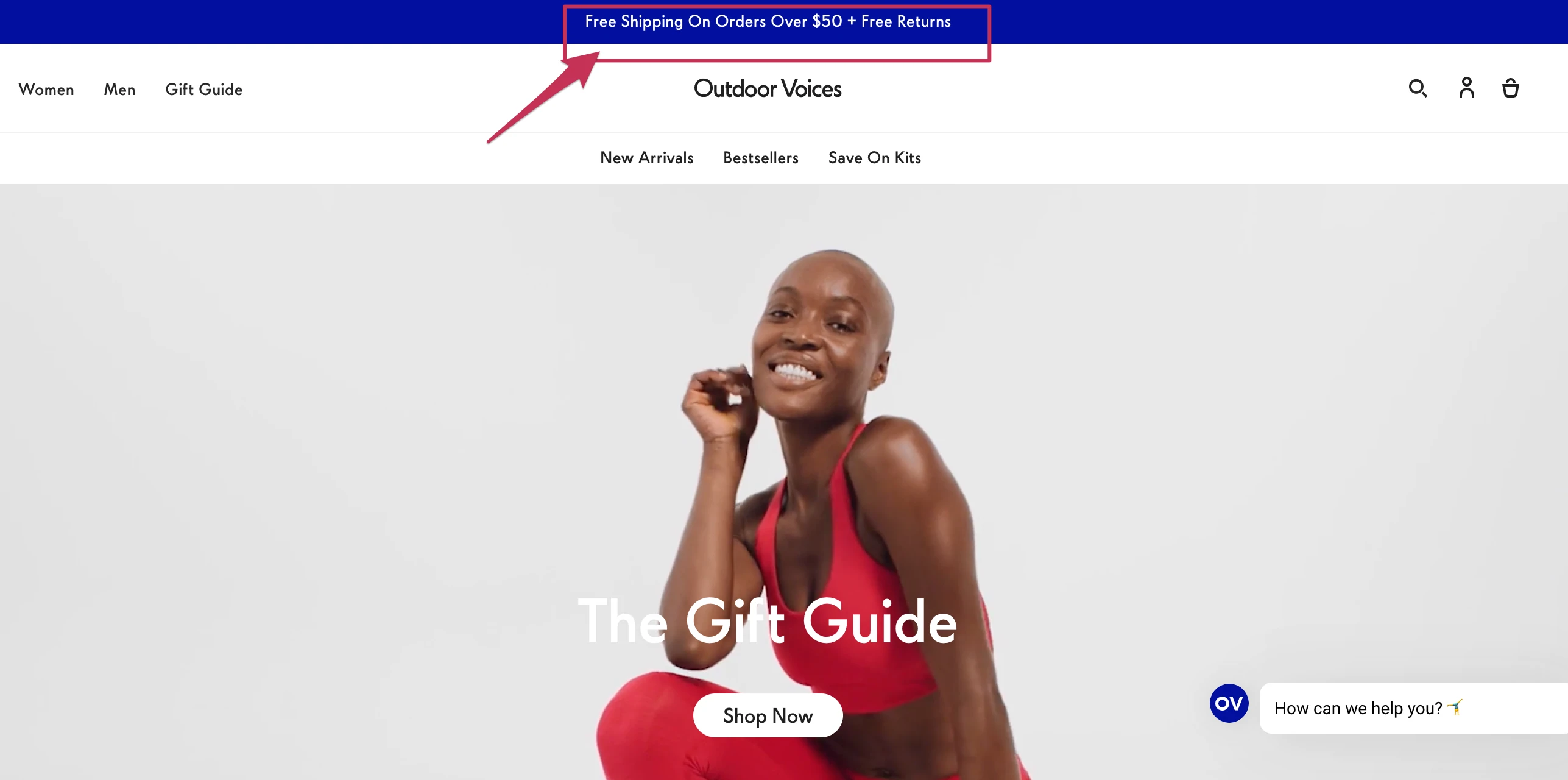Outdoor Voices 在其网站上使用的公告栏不会分散其横幅图像的注意力。 但是,它确实告诉客户当他们花费一定金额时获得免费送货和退货的重要机会。 通过公告栏将此类特殊促销活动整合到您的主页中可以帮助您展示次要的号召性用语,例如迎合注重价格的购物者的优惠。