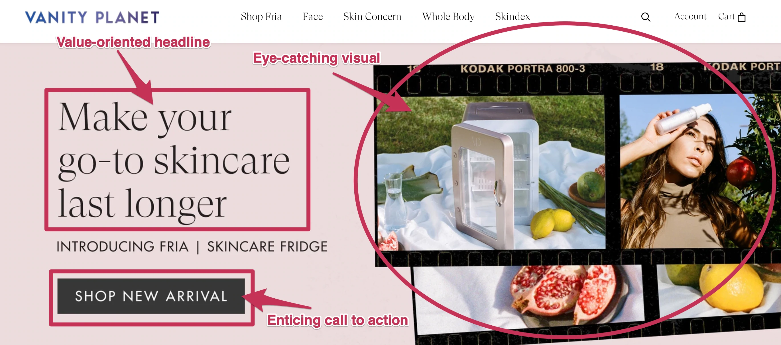 美容品牌 Vanity Planet 在其网站上拥有强大主页横幅的所有必要元素: