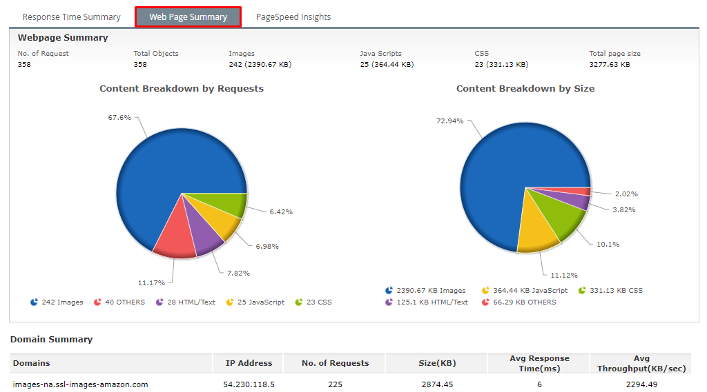 我看到这个工具的方式,最好的功能是页面分析选项卡。 它显示每个状态(等待、连接、接收等)花费的时间、每个内容类型(图像、脚本、HTML 等)花费的时间和每个域花费的时间。 此信息通常被证明对识别增加整体页面加载时间的页面元素有很大帮助。
