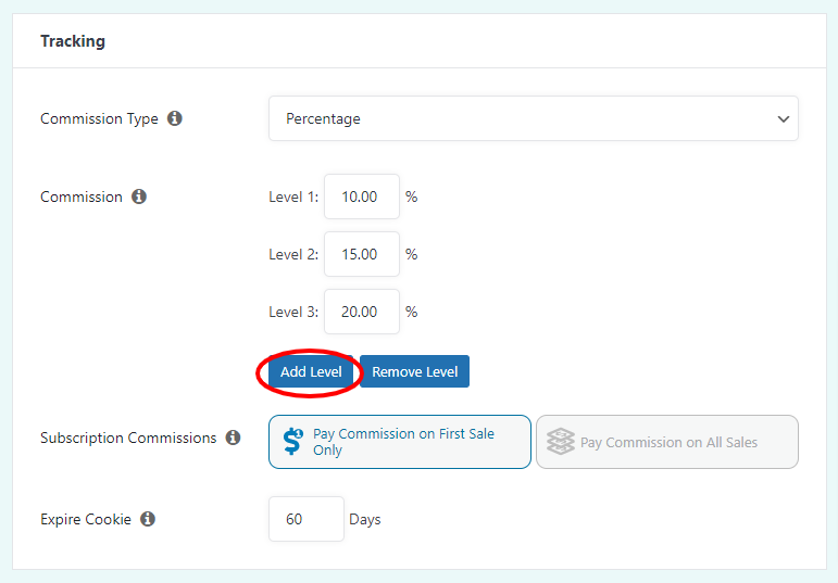使用此頁面,您可以選擇通過單擊“添加級別”按鈕並在相關字段中輸入相應的百分比來創建具有不同費率的多個佣金級別。