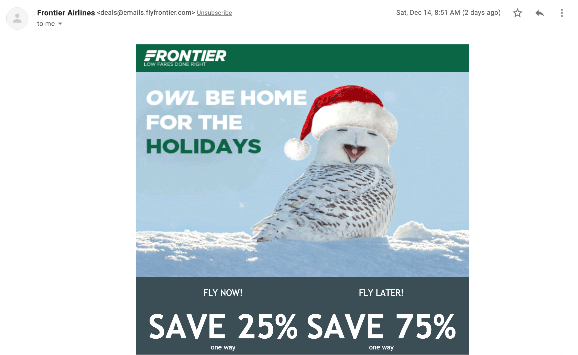 來自 Frontier 的這封電子郵件在涉及首屏內容時選中了所有正確的框。 它具有吸引人的英雄形象(你怎麼能不喜歡戴著聖誕帽的貓頭鷹呢?)、詼諧的文案和強大的交易以及簡單的 CTA——所有這些都在首屏。
