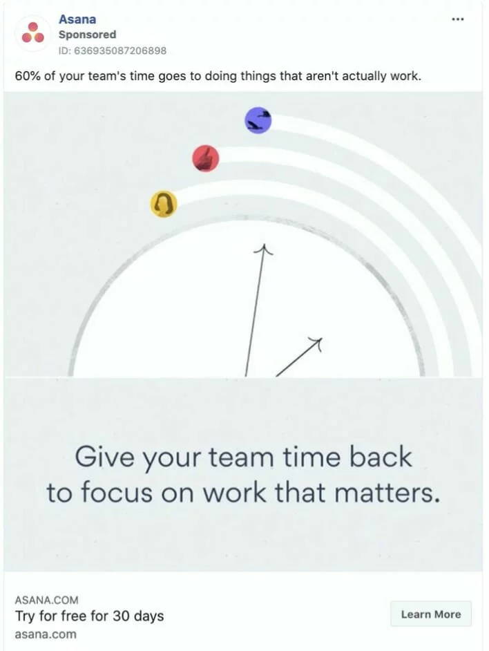 廣告創意應使用對比色和引人入勝的版面來脫穎而出並吸引觀眾的注意。 避免過度飽和的色調,以免融入網站背景。 此 Asana 廣告有效地利用了廣告空間,使訊息(文字)脫穎而出: