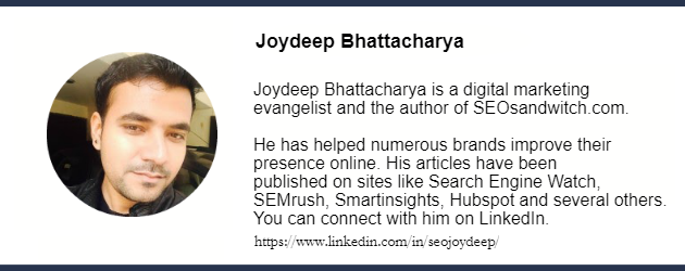 Joydeep Bhattacharya 是一名數字營銷傳播者,也是 SEOsandwitch.com 的作者。 他曾幫助眾多品牌提升其在線形象。 他的文章已發表在 Search Engine Watch、SEMrush、Smartinsights、Hubspot 等網站上。 您可以在 LinkedIn 上與他聯繫。