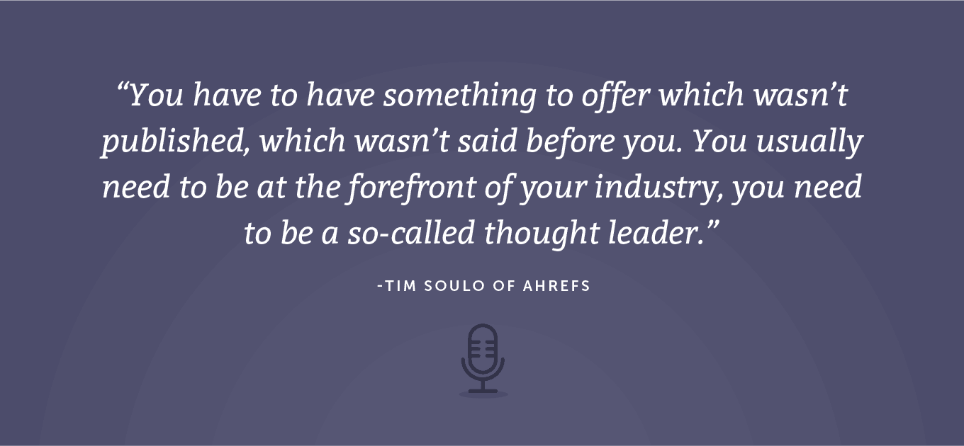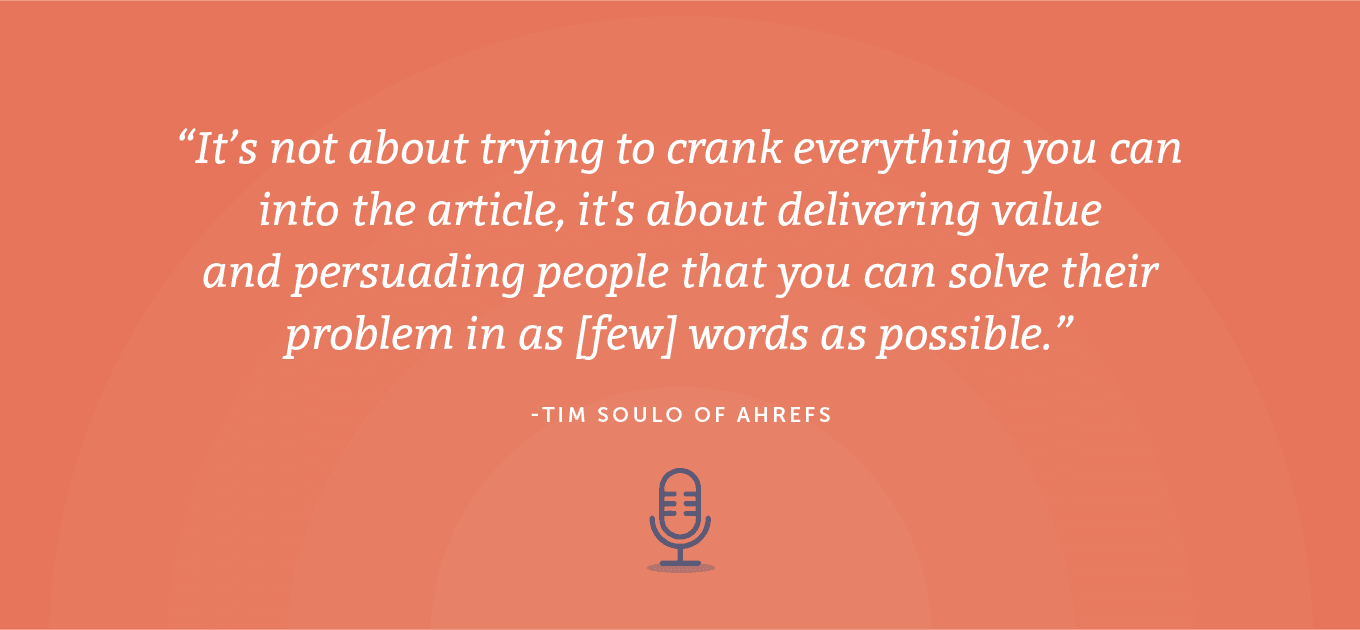 在我看來,如果你想在谷歌中排名,如果你想讓人們關注你的內容,鏈接到它,與他人分享,你需要提供一些東西,所以你仍然需要做研究. 您必須了解與您所針對的主題相關的所有內容。 您需要進行更多研究,但隨後,您不需要創建相同的文章,相同的研究。 你必須提供一些完全獨特的東西,或者至少,你應該選擇另一個角度。 例如,我最喜歡的方式之一就是180度大轉彎,挑戰現狀。 我喜歡質疑排名靠前的結果怎麼說,做我自己的研究,做我自己的實驗,然後判斷我是否同意或不同意某個主題的常規知識。 這類事情,通常會引起很多關注。 人們喜歡鏈接到這些東西,這就是你如何登上谷歌的榜首,這就是你如何超越已經排名的文章。 Nathan:在 Ahrefs,你們正在發布令人驚嘆的內容。 我一直是粉絲有一段時間了,我想知道,在發布之前,您是否有每件作品需要滿足的性能或質量標準? 你如何確保你提供了額外的價值? 蒂姆:我想說這並沒有什麼神奇之處。 我們只是嘗試遵循簡單明了的邏輯。 我們在開始寫文章之前進行研究。 在我們選擇一個主題後,我們會研究排名靠前的結果。 我們將決定什麼會使我們的文章比目前的結果更好。 當然,我們並不認為寫一篇更長或更詳細的文章會更好。 我們真的在尋找另一個角度,或者我們正在尋找其他文章中沒有提到的完全獨特的東西。 很難 [00:13:23] 使用一些循序漸進的公式,但實際上,您需要做的是您需要了解您是否有一些未發表的東西要提供,這在您之前沒有說過。 為此,您通常需要站在行業的最前沿,您需要成為所謂的思想領袖。 我很容易說,因為在 Ahrefs,我擁有大量數據,而且我與超級聰明的人一起工作。 如果我想在搜索引擎優化、反向鏈接或關鍵字方面進行一些研究,我會去我們的數據科學團隊。 我要求他們進行研究,他們將結果回复給我,這樣我就可以發布以前從未有人說過的完全獨特的內容。