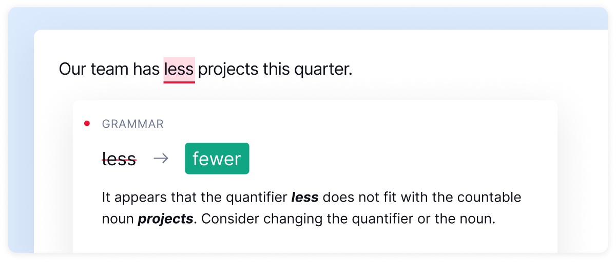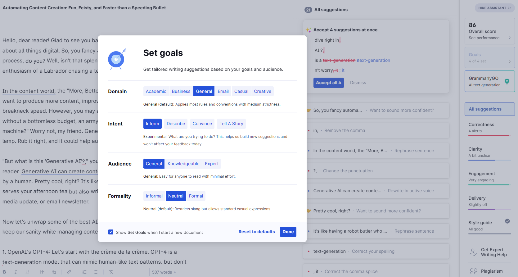 它為您提供有關如何修復這些錯誤的建議,幫助您的內容讀起來像夢一樣。 您所要做的就是批准更改! 您也可以選擇客製化 Grammarly 的建議,以更緊密地滿足您的內容需求。