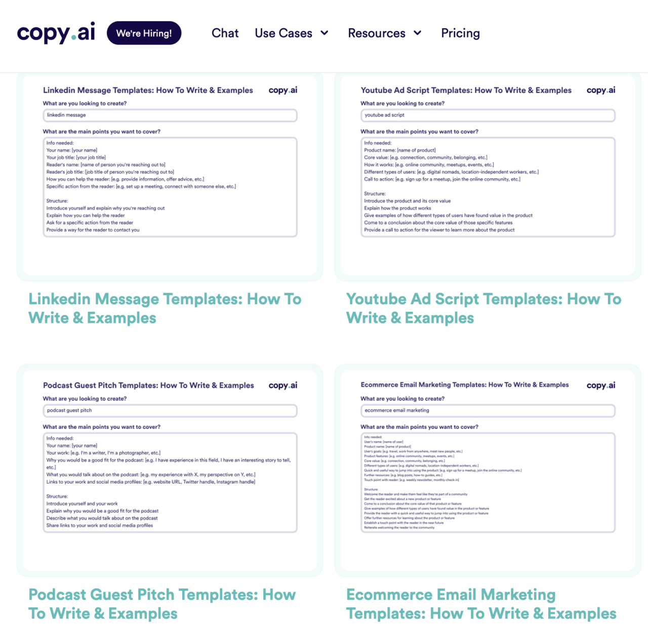對於更實惠的選擇, Copy.ai是一個很好的選擇。 它具有高度可自訂性,包含模板並提供近 100 個提示和工具,使您能夠針對多個平台和需求簡化內容: