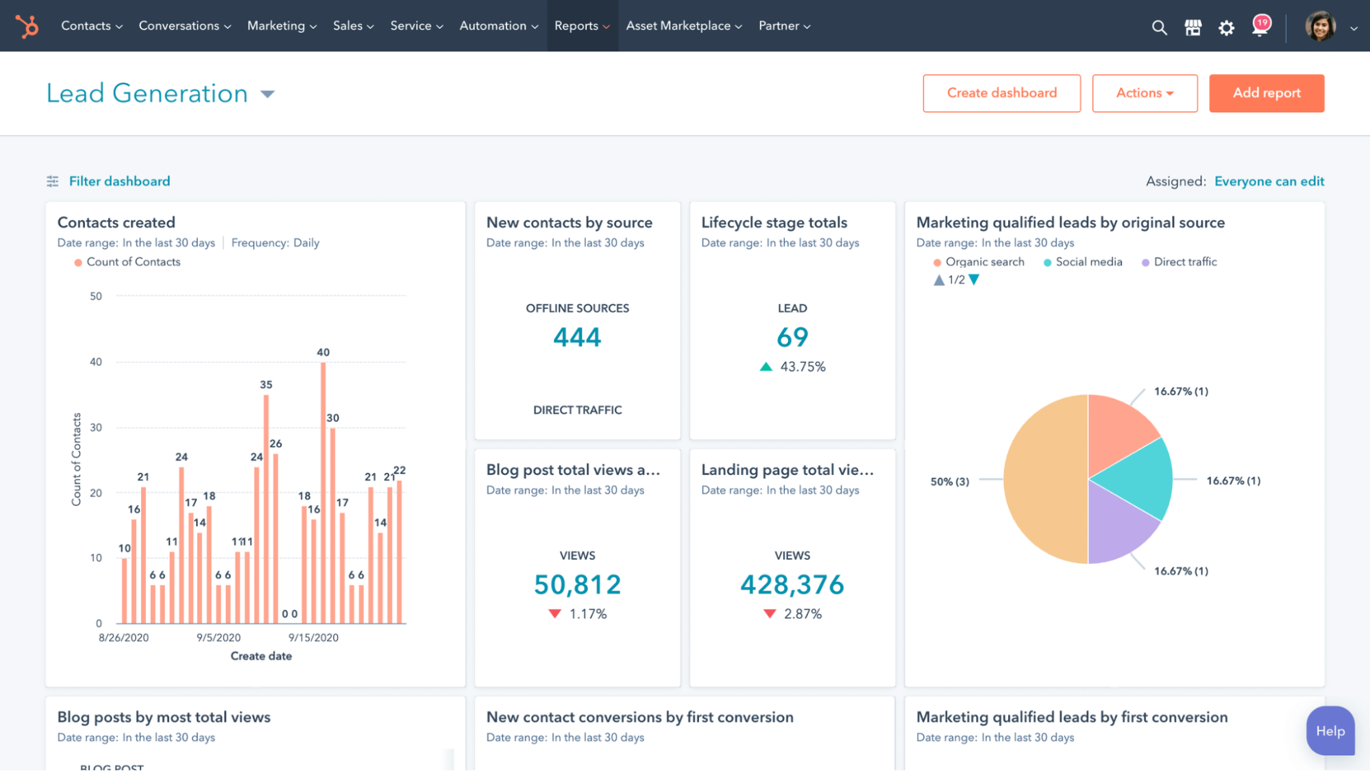 例如, HubSpot收集並報告有關您的部落格文章、網站和廣告的數據。 它提供了有關用戶行為和偏好(例如,登陸頁面瀏覽量、最受歡迎的部落格文章、網站參與度)的寶貴見解,您可以用它來改進您的內容和行銷活動。