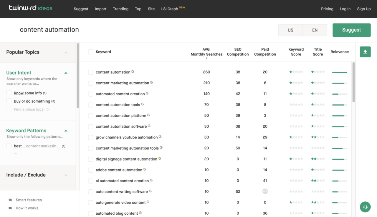 Twinword使用 AI 幫助您找到適合您內容的排名靠前的關鍵字和短語。 只需輸入關鍵字,您就可以存取關鍵字提示、基於關鍵字的熱門主題、平均每月搜尋量、競爭情況等。 它具有高級過濾功能,例如按用戶意圖或關鍵字模式: