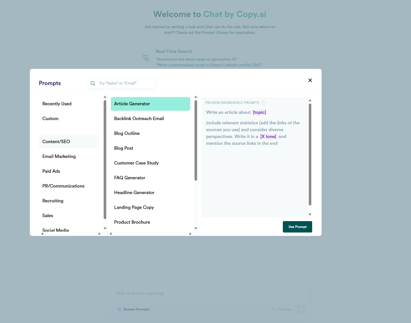 或者您可以簡單地從各種提示中進行選擇並填寫空白。 Copy.ai 還有一個工具可以改進您的提示以提供最準確的回應。
