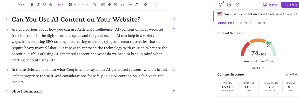複製 AI 產生的文字並將其貼上到 Surfer 的內容編輯器中。 人工智慧將分析您的內容,並即時提供有關其 SEO 排名、關鍵字利用率和結構(例如單字、段落、標題)的詳細報告和建議。 因此,您可以在平台上編輯文本,並在您眼前看到您的排名提升。