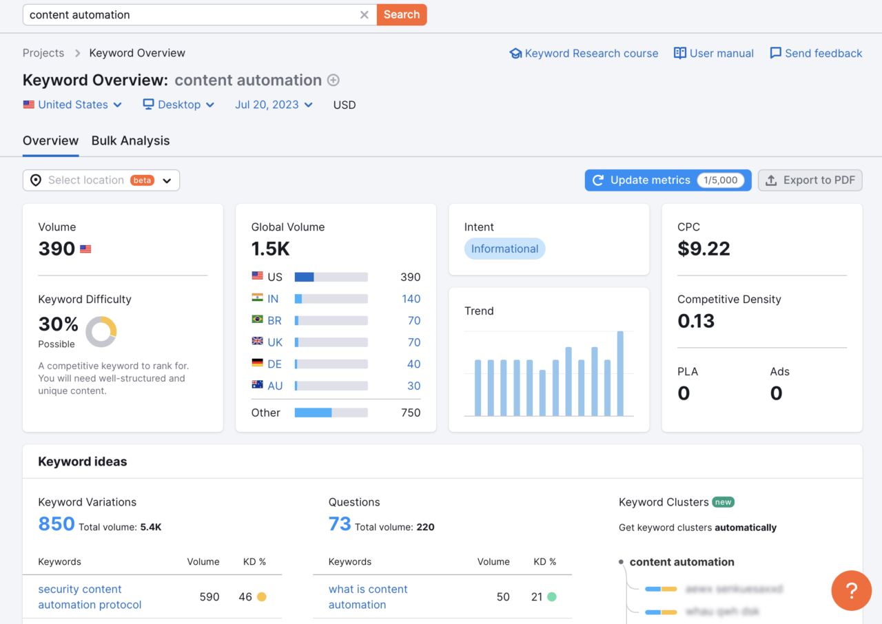 例如, Semrush是一款由人工智慧驅動的內容行銷工具,提供多種功能,可協助您找到適合您內容的最佳關鍵字。 只需在頂部的搜尋欄中輸入關鍵字,即可探索各種見解,從數量和難度到變化和 CPC(每次點擊費用):