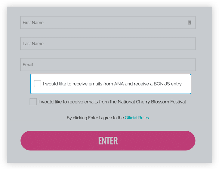 參賽作品非常簡單。 人們訪問了該活動並通過表單提交了一個條目。 如果參賽者願意,他們可以選中一個框來註冊 ANA 的電子郵件營銷列表,並獲得一份獎金作為回報。