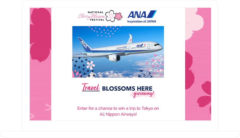 全國櫻花節創建了Travel Blossoms Here贈品活動,作為一項明智的活動,旨在吸引對休閒旅行感興趣的人們。 全國櫻花節通過一年一度的節日慶祝美國和日本之間的友誼。 他們與總部位於日本的航空公司全日空 (ANA) 合作,贈送了兩張飛往東京的經濟艙往返機票。