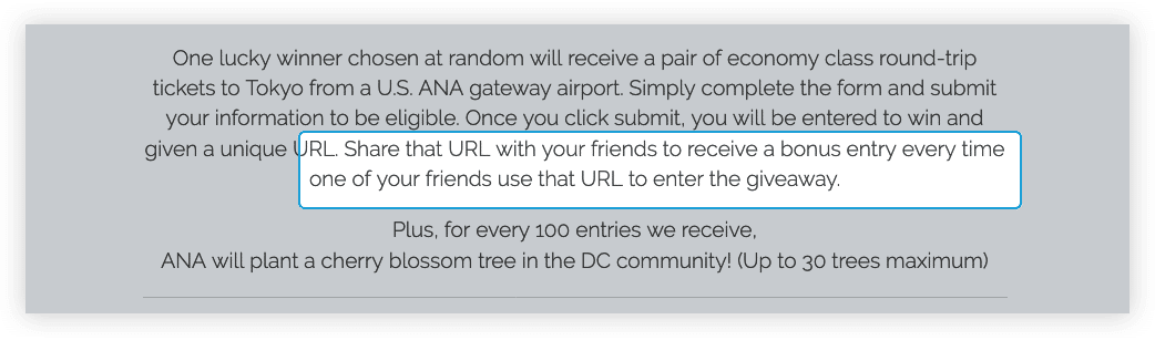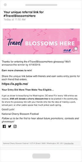 社交媒體共享是一個強大的工具。 如果做得好,推薦朋友比賽會鼓勵人們分享您的活動,以增加他們獲勝的機會並為您收集合格的潛在客戶。 全國櫻花節的活動就是一個很好的例子。 他們通過 ANA 提供的獎品非常適合他們的目標市場。 反過來,他們通過推薦朋友競賽收集到的潛在客戶以及他們獲得的品牌知名度將推動未來的營銷工作。