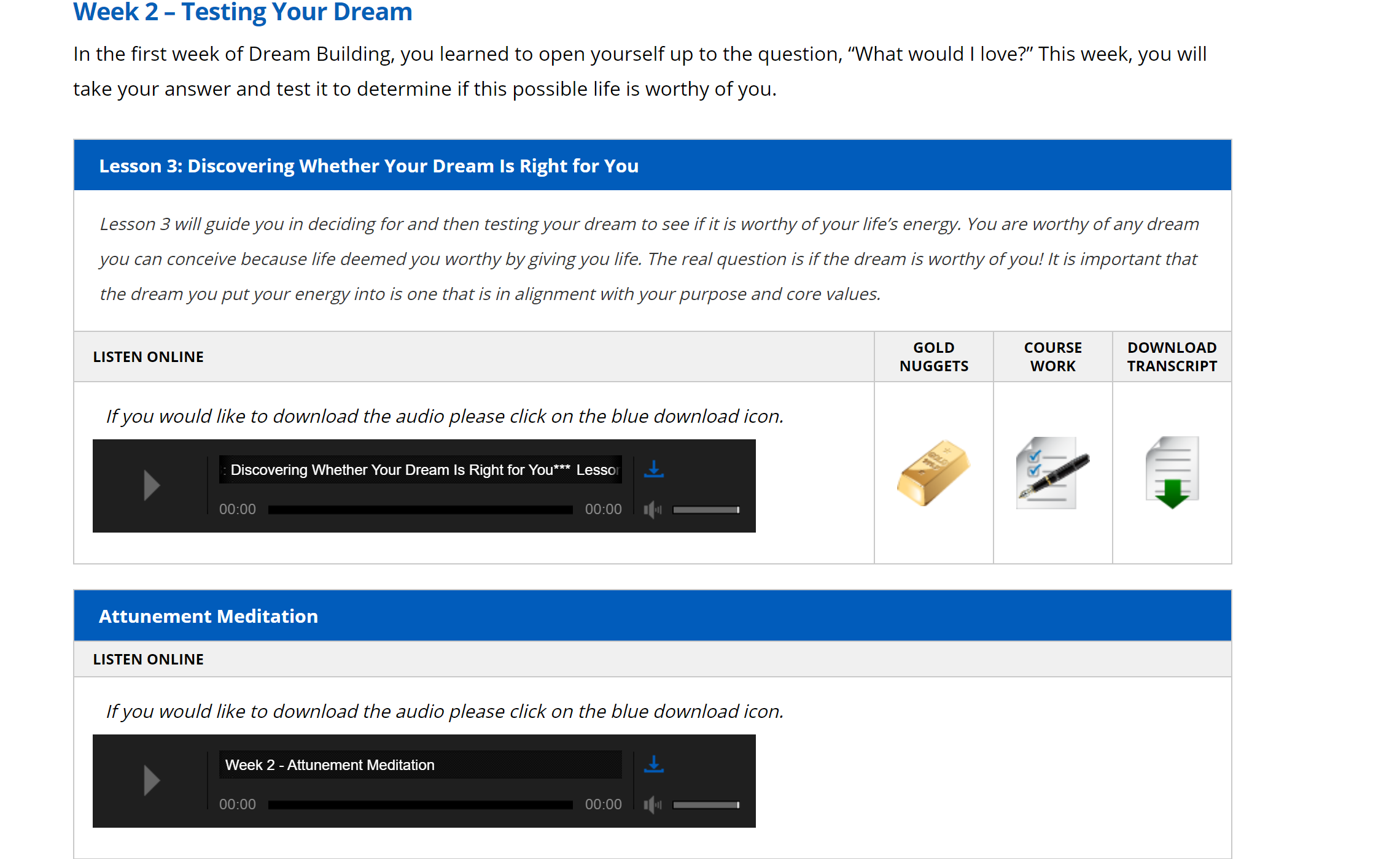 正如我們上面所討論的,這兩種音頻都伴隨著額外的冥想音頻、金塊、課程作業和成績單。 [這適用於每個音頻和每週