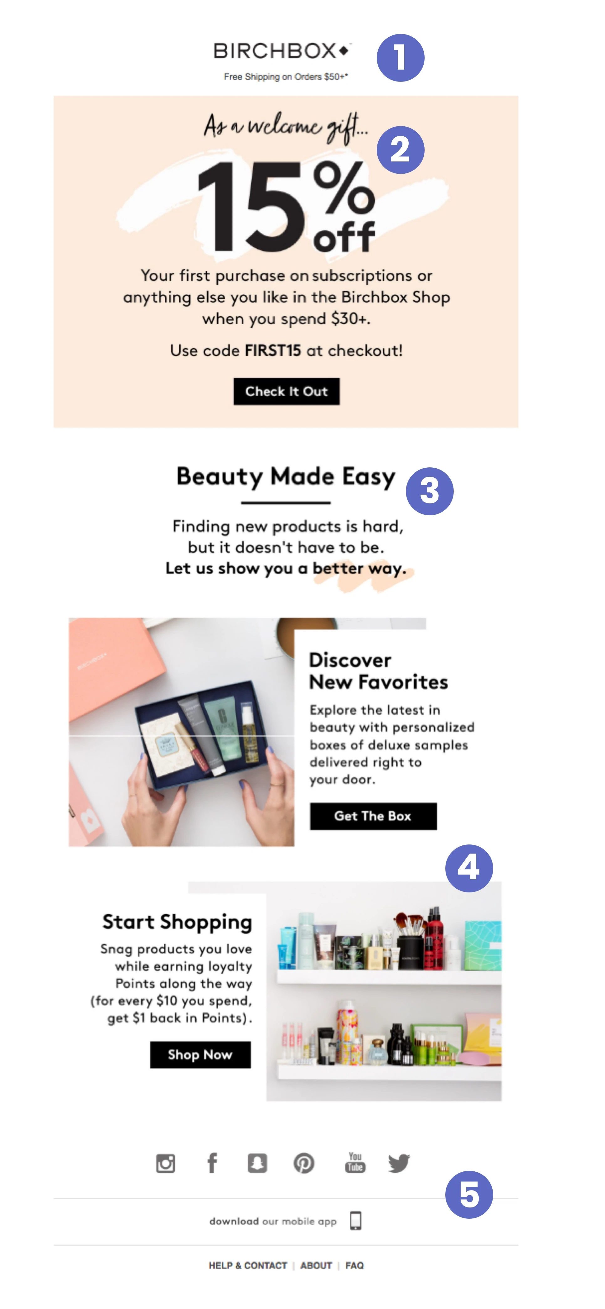 第一封電子郵件的第一個頁腳對於不太緊急的行動呼籲很有用。 鑑於我們對他們的品牌不熟悉,Birchbox 鼓勵我們下載他們的應用程序並加入社區。 還有直接鏈接到客戶支持、他們的關於我們頁面和常見問題解答,以備我們需要時使用。