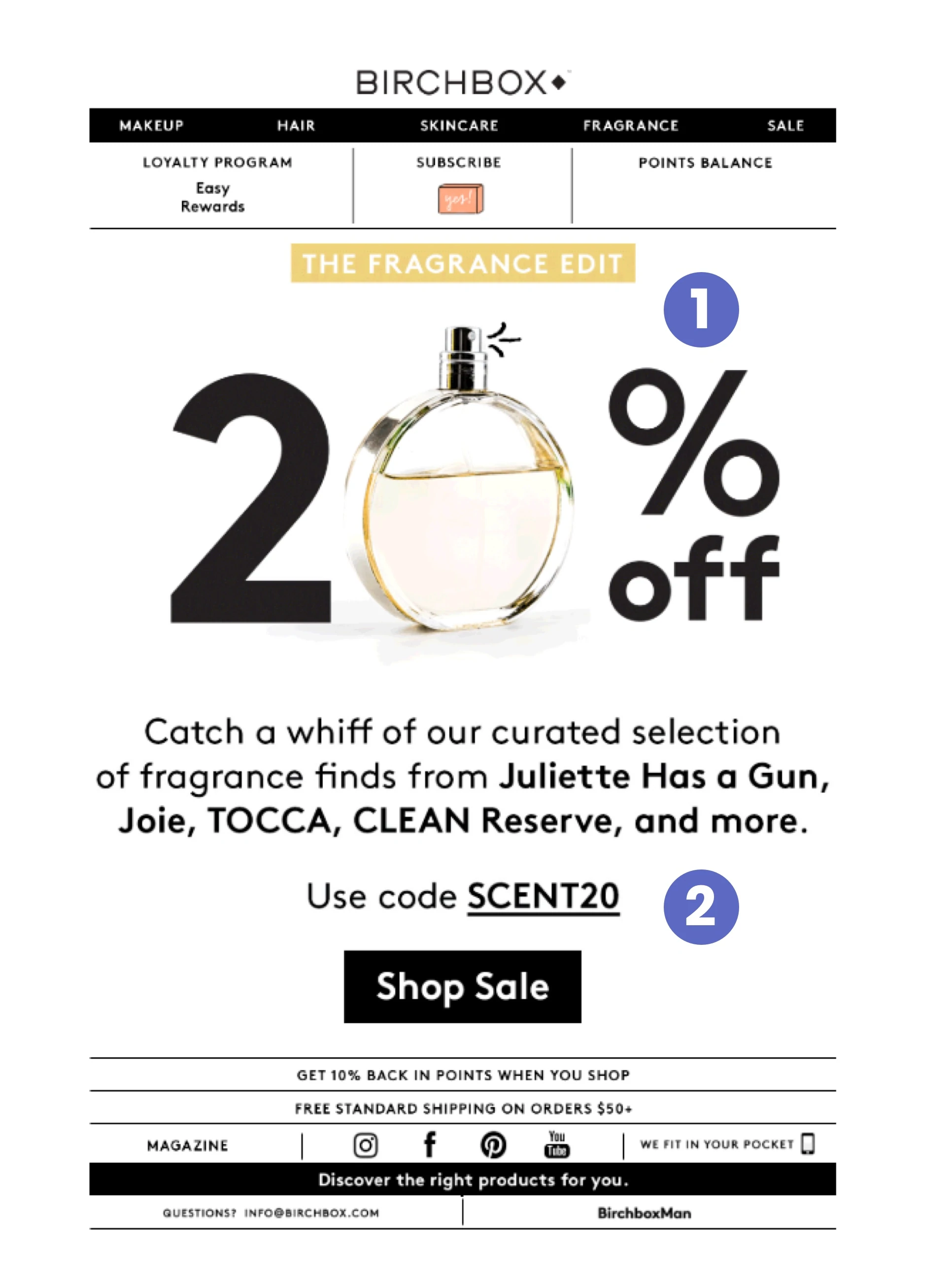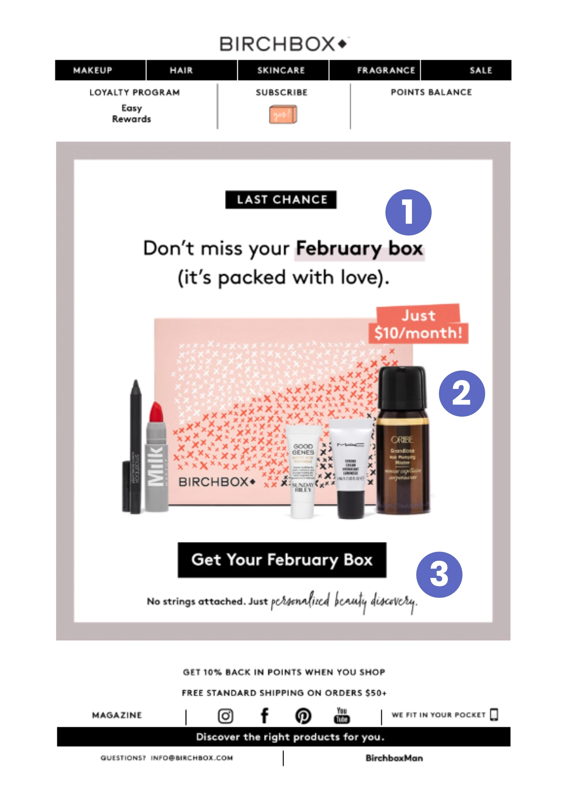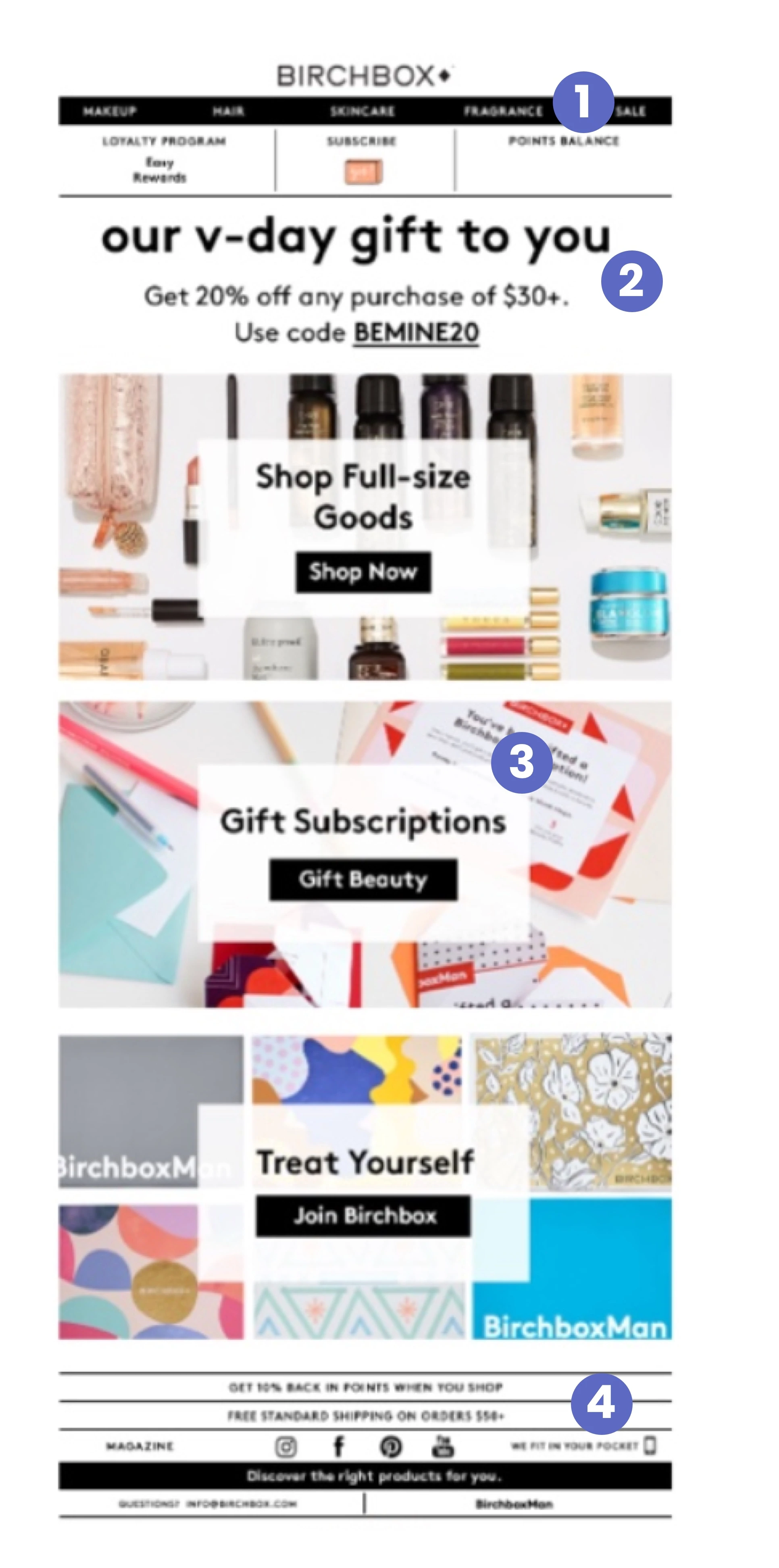 我們繼續看到直接與目標受眾對話的隨意而簡潔的文案。 再一次,Birchbox 將他們的折扣代碼定位為“禮物”,不僅可以吸引您的興趣,還可以提醒您情人節是送禮的好時機。